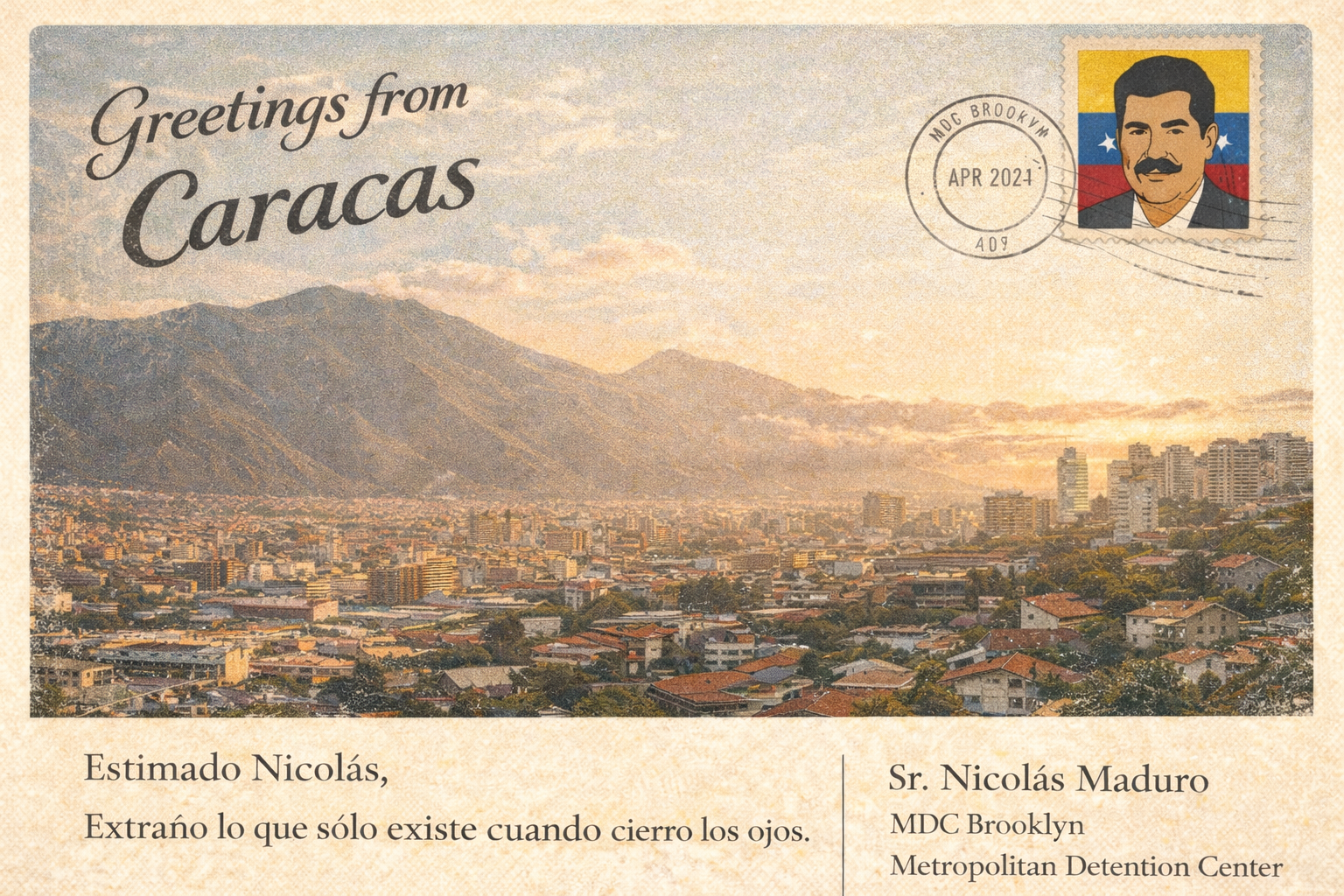 Send Maduro A POSTCARD IN JAIL! $1 from each $3.99 postcard goes to St. Jude Children´s Research Hostpital! send your postcard now Food Postcards: Jail´s Delicacies Collection Wish You Were… Caracas Brooklyn NY Arepa Send your postcard $1 Donated to St. Jude per card sent!